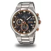 Modelos nuevo con una esfera en capas y piezas especialmente configuradas para crear un diseño audaz. Las agujas y botones tienen detalles en tonos rojos.